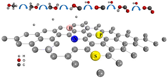Bagotski et al. presented the generally acknowledged premise of methanol oxidation via catalysis in 1977. He pointed out that methanol molecules are chemisorbed on the catalyst surface with the direct result of dehydrogenation forming C***−OH and 3Hads (*** indicates three valence bonds with the surface). Step-by-step, partially dehydrogenated chemisorbed particles, such as C*H2OH, and C**HOH, are formed in the middle of the dehydrogenation (Figure 7). Thus, the electro-oxidation of methanol on platinum proceeds via the interaction of adsorbed radicals OHads with chemisorbed C*−OH. Finally, CO2 is produced with intermediate products such as C**=O and OH−C*=OH. However, catalysts have their issues, such as platinum getting poisoned by CO, which is an intermediate product of the methanol oxidation reaction [92]. An advanced supporting material could be an effective solution to these types of problems which offers an increment of stability and durability, morphology, and amplified electrical conductivity. The intrinsic properties of CBMs have helped them to attain most of these qualities; however, they can be greatly increased by doping different heteroatoms.