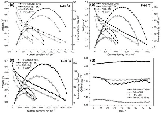 DMFC single-cell properties of different catalysts at (a) 30, (b) 60, and (c) 90 °C. (d) Durability test of DMFC single cells with different catalysts at 30 °C using 2 mol L−1 methanol solution. It can be seen that the as-synthesized PtRu/NCNT-GHN catalyst demonstrates good stability at a higher output voltage than other MEO catalysts. Reproduced with permission from [98], Copyright@2011, John Wiley and Sons.