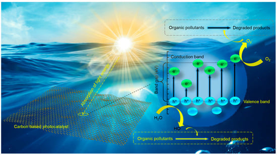Some advanced CBMs, such as GCN, graphene, and GOs, are also used as metal-free green catalysts for the photochemical degradation of organic pollutants from water (Figure 1). These materials have a narrow or zero band gap between their valence band and conduction band, and thus, are capable of producing pairs of photogenerated electrons and holes by using renewable energies from sunlight [9]. However, the slower rate of charge transfer and the charge-carrier recombination in pure CBMs compared to conventional inorganic catalysts (such as TiO2, ZnO, and SnO2 nanoparticles) limits their photocatalytic performances. To overcome these limitations, various heteroatoms are doped into these photo-active CBMs. It has been found in many studies that the heteroatom doping of these materials helps to increase their light absorption capacity [10], promotes charge separation [11], differs the electron/hole recombination rate [12], and increases the rate of charge transfer. Therefore, the heteroatom-doped CBMs are promising photocatalysts for the decomposition of organic pollutants.