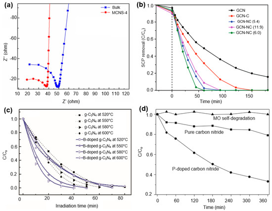 Some advanced CBMs are promising candidates for the photocatalytic degradation reactions of various complex organic pollutants. However, one major drawback of these pure CBMs is their inherent low charge conductivity [106], which results in the recombination of some photogenerated electron/hole pairs. Consequently, the overall process efficiency is decreased. Different heteroatoms are doped with these pure CBMs to resolve this problem [100,107,108]. The dopant elements are composed of different electronic configurations compared to the regular C-atoms of the pristine CBMs. Therefore, p-type or n-type electronic properties can be induced into these materials by doping with various heteroatoms, and thus, the electronic conductivity of the pristine CBMs is improved. As a consequence, the rate of transfer of the photogenerated charge (electrons and holes) is increased, and the recombination of the electron/hole pairs is different [12]. Jourshabani et al. [107] described the effect of doping of mesoporous sulfur in graphitic carbon nitride (GCN) photocatalysts. The electrochemical impedance spectroscopy profile of the S-doped and undoped GCN showed a dramatic decrease in the charge transfer resistance of the photocatalysts after S-doping (Figure 10a). The delocalized lone pair electrons of the S-atom on the π-conjugated tri-s-triazine units were attributed to this extensive conductivity. A similar effect was observed in N-doped carbon nanosphere (CNS)-GCN composites [12]. Furthermore, the light absorption capacity of the doped CBMs is also increased due to the induced semiconducting properties [10]. Hu et al. [104] investigated the doping effect of phosphorous on the photocatalytic activity of mesoporous GCN. The catalytic activity of the pristine mesoporous GCN increased about 31.1 times after doping with phosphorous atoms. The synergistic effect of the higher light absorption in the visible range, faster separation, and conduction of photogenerated charges and the differed electron/hole pair recombination improves the catalytic performances of the doped CBMs [100,104,107]. However, the dopant concentration is an important factor to consider. Liu et al. [12] showed that the N-doping of a CNS-GCN composite decreases its electron transfer barrier. However, over dosage of dopant elements alleviates light absorption as well as resists electron transfer (Figure 10b).