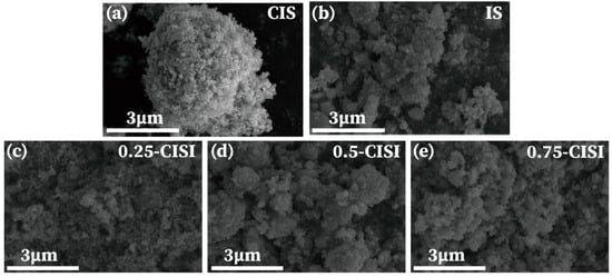 The morphologies of the as-prepared samples were characterized via scanning electron microscopy (SEM) (Figure 1). Clearly, the irregular particles can be observed over CIS and IS due to the agglomeration of their nanosheets (Figure 1a,b), which is confirmed by the below TEM images. Furthermore, the particular morphologies of the CISI composites are similar to that of CIS and IS (Figure 1c–e), indicating the maintenance of the overall structure for the CISI composites.