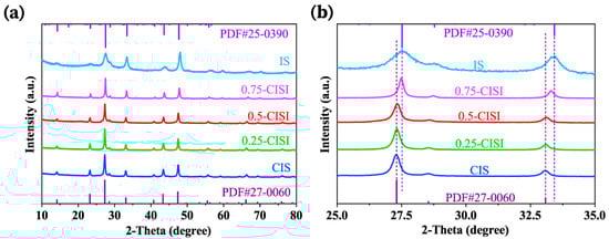 The crystal structure of the as-prepared samples was monitored by XRD measurements. As shown in Figure 3a, the characteristic peaks of CIS and IS are well matched with their respective standard crystal structures of PDF#27-0060 and PDF#25-0390. Notably, the characteristic peaks of CIS are similar to those of IS except for the differences at 27.3 and 33.0°. After coupling CIS with IS, the characteristic peaks of 0.25 CISI, 0.5 CISI, and 0.75 CISI are almost unchanged related to CIS and IS originally. For the enlarged XRD patterns (Figure 3b), the characteristic peaks of 0.25 CISI and 0.5 CISI are derived from CIS, while the characteristic signals of 0.75 CISI are stemmed from IS. Thus, it can be reasonably concluded that the CISI composites have been successfully synthesized with the components of CIS and IS.