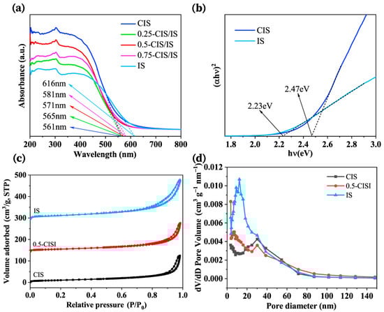 The optical properties of CIS, IS, and CISI composites were investigated (Figure 4a). The absorption band edges of IS and CIS are at 561 and 616 nm, respectively, showing good visible light harvesting capacity. After coupling CIS with IS, the light absorption capacities of the CISI composites are improved compared to the single IS. Meanwhile, based on the Kubelka–Munk function [36,37], the bandgap values of CIS and IS are calculated to be 2.47 and 2.23 eV, respectively.