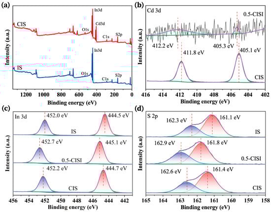 The X-ray photoelectron spectroscopy (XPS) technique was employed to determine the elemental composition and atomic states of CIS, IS, and 0.5 CISI. As shown in Figure 5a, the XPS survey spectra of CIS and IS demonstrated that they mainly contain elements of Cd, In, and S, while the sample of IS has no signals of Cd. As for the XPS of the Cd 3d spectrum of CIS (Figure 5b), two strong peaks appear at 411.8 and 405.1 eV, corresponding to Cd 3d3/2 and Cd 3d5/2, respectively [29]. However, the peak positions in 0.5 CISI are positively shifted to 412.2 and 405.3 eV. This indicates that the elemental valences of Cd in CIS and 0.5 CISI are +2 [40]. The XPS In 3d spectrum of CIS shows two peaks centered at 452.3 eV and 444.7 eV (Figure 5c), which are assigned to In 3d3/2 and In 3d5/2, respectively [41]. These two characteristic peaks also appear in pure IS. After coupling CIS with IS, there is an obviously positive shift for XPS iIn the 3d spectrum of 0.5 CISI compared to CIS and IS. As shown in Figure 5d, the S 2p XPS spectra of CIS and IS possess similar signals at ~162.6 and ~161.4 eV, which belong to S 2p1/2 and S 2p3/2, respectively [42]. Clearly, these two peaks of XPS S 2p in 0.5 CISI also exhibit a positive shift related to CIS and IS. Combined with the XPS results of Cd 3d and In 3d, we reasonably conclude that there is a strong interaction existing in the CIS/IS heterojunction, which is conducive to the efficient charge carrier transfer [43].