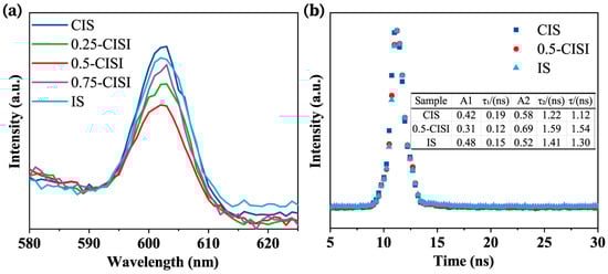 The steady-state photoluminescence (PL) spectra of the as-prepared samples were employed to investigate the charge separation behavior (Figure 6a) [44]. The PL peak intensities of 0.25 CISI, 0.5 CISI and 0.75 CISI are weaker than those of CIS and IS, demonstrating that the heterojunction formation between CIS and IS can effectively promote the charge separation. Additionally, the highest PL intensity being that of the 0.5 CISI sample suggests that the proper mass ratio between CIS and IS can achieve the effective heterojunction for efficient charge carrier separation, resulting in the improved photocatalytic activity for Cr(VI) reduction.
