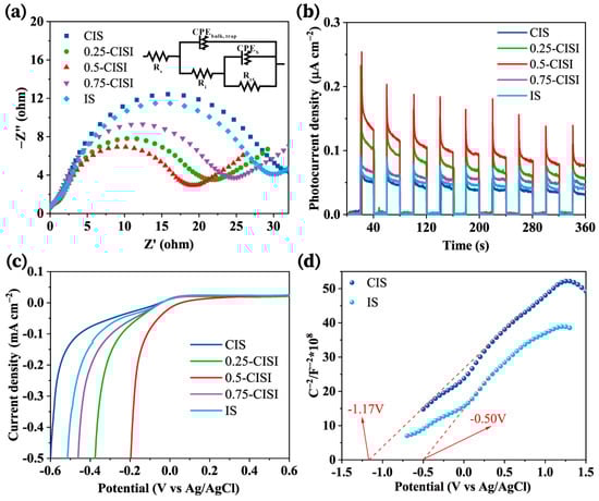 The electrochemical impedance spectra (EIS) and the transient photocurrent responses (TPRs) were performed to reveal the charge separation and migration behavior of the samples [47,48,49]. As for the EIS measurements, the smaller arc radius is closely related to the lower interfacial resistance, resulting in a higher charge migration efficiency in the Nyquist plots. As shown in Figure 7a, the arc radii of 0.25 CISI, 0.5 CISI, and 0.75 CISI are smaller than those of CIS and IS, demonstrating that the formation of the heterojunction can effectively reduce the interfacial resistance and thus promote the charge carrier separation. The optimal sample, 0.5 CISI, has the smallest arc radius, which means the highest migration rate of photogenerated charge carriers in all CISI composites.