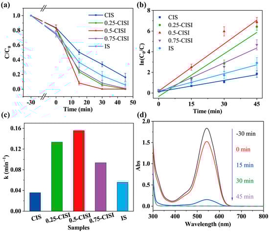The photocatalytic activity of the as-prepared samples was evaluated by Cr(VI) reduction under visible light irradiation. As shown in Figure 8a, the samples of CIS and IS show relatively low photocatalytic activity due to their rapid recombination rate of the photogenerated charge carrier. After coupling CIS with IS, the CISI composites exhibit a higher Cr(VI) photoreduction activity than CIS and IS. Then, the enhanced photo-activity of the CISI composites is assigned to the efficient charge carrier separation derived from the heterojunction formation between CIS and IS. Correspondingly, the reaction rate constants of all samples are measured with the following order: CIS (0.03554 min−1) < IS (0.05578 min−1) < 0.75 CISI (0.09358 min−1) < 0.25 CISI (0.13313 min−1) < 0.5 CISI (0.15561 min−1) (Figure 8b,c). Notably, the optimal sample of 0.5 CISI has the highest Cr(VI) photoreduction efficiency, indicating that the proper mass ratio between CIS and IS is necessary to achieve the effective heterojunction for boosting photocatalytic activity. To monitor the photocatalytic process of Cr(VI) reduction, the UV-vis spectral changes over 0.5 CISI are displayed in Figure 8d toward the Cr(VI) solution with an absorption characteristic peak at approximately 540 nm. As the irradiation time increases, the peak intensity is gradually decreased and Cr(VI) is almost completely removed within 45 min. In addition, the overall Cr(VI) photoreduction efficiency over 0.5 CISI is higher than that of most reported photocatalysts, as listed in Table 1.