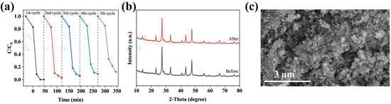 (a) Cyclic performance of 0.5 CISI for the reduction of aqueous Cr(VI) under visible light irradiation. (b) XRD patterns of 0.5 CISI before and after Cr(VI) photoreduction for five cycles. (c) SEM image of 0.5 CISI after Cr(VI) photoreduction for five cycles.