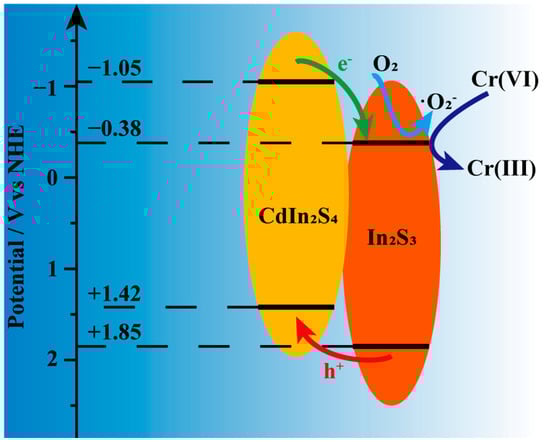 - Zheng, X.; Liu, T.; Wen, J.; Liu, X. Flower-like Bi2S3–In2S3 heterojunction for efficient solar light induced photoreduction of Cr (VI). Chemosphere 2021, 278, 130422. [Google Scholar] [CrossRef]