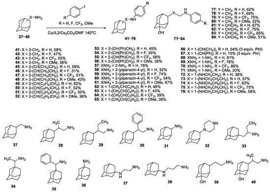 - Panchenko, S.P.; Abel, A.S.; Averin, A.D.; Maloshitskaya, O.A.; Savelyev, E.N.; Orlinson, B.S.; Novakov, I.A.; Beletskaya, I.P. Arylation of adamantanamines: VIII. Optimization of the catalytic system for copper-catalyzed arylation of adamantane-containing amines. Russ. J. Org. Chem. 2017, 53, 1497–1504. [Google Scholar] [CrossRef]