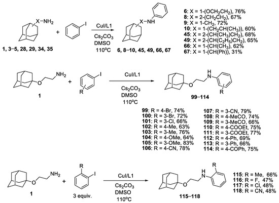 - Averin, A.D.; Panchenko, S.P.; Abel, A.S.; Maloshitskaya, O.A.; Butov, G.M.; Savelyev, E.N.; Orlinson, B.S.; Novakov, I.A.; Beletskaya, I.P. Arylation of adamantanamines: IX. Copper(I)-catalyzed arylation of adamantane-containing amines. Russ. J. Org. Chem. 2017, 53, 1788–1798. [Google Scholar] [CrossRef]
