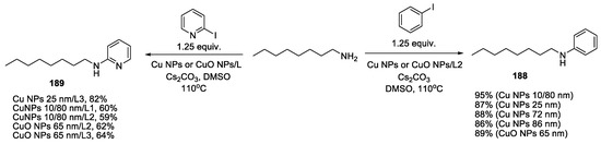 - Kuliukhina, D.S.; Averin, A.D.; Panchenko, S.P.; Abel, A.S.; Savelyev, E.N.; Orlinson, B.S.; Novakov, I.A.; Correia, C.R.D.; Beletskaya, I.P. CuI and Copper Nanoparticles in the Catalytic Amination of 2-Halopyridines. Russ. J. Org. Chem. 2022, 58, 167–174. [Google Scholar] [CrossRef]