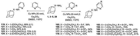 - Abel, A.S.; Averin, A.D.; Anokhin, M.V.; Maloshitskaya, O.A.; Butov, G.M.; Savelyev, E.N.; Orlinson, B.S.; Novakov, I.A.; Beletskaya, I.P. Arylation of adamantanamines: VII. Copper(I)-catalyzed N-heteroarylation of adamantane-containing amines with halopyridines. Russ. J. Org. Chem. 2015, 51, 301–308. [Google Scholar] [CrossRef]