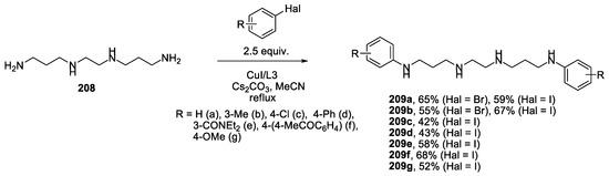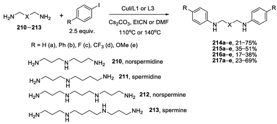 - Panchenko, S.P.; Averin, A.D.; Anokhin, M.V.; Maloshitskaya, O.A.; Beletskaya, I.P. Cu(I)-catalyzed N,N′-diarylation of natural diamines and polyamines with aryl iodides. Beilstein J. Org. Chem. 2015, 11, 2297–2305. [Google Scholar] [CrossRef]