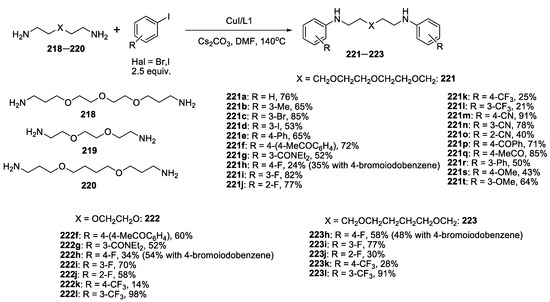 - Anokhin, M.V.; Averin, A.D.; Beletskaya, I.P. Copper-Catalyzed Arylation of Oxadiamines and Polyamines. Eur. J. Org. Chem. 2011, 2011, 6240–6253. [Google Scholar] [CrossRef]
