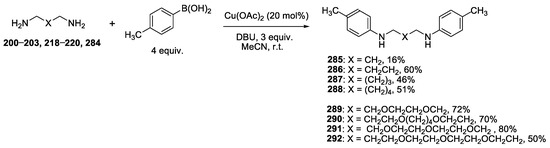 - Kuliukhina, D.S.; Yakushev, A.A.; Malysheva, A.S.; Averin, A.D.; Beletskaya, I.P. Synthesis of N,N′-Diaryl Diamines and Oxadiamines via Chan–Lam Amination. Russ. J. Org. Chem. 2022, 58, 1752–1758. [Google Scholar] [CrossRef]