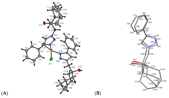 Compound 16 was characterized via X-ray diffraction analysis (Figure 4, see also Table S1, Figures S1 and S2 in Supplementary Materials). The X-ray structure revealed that complex 16 contains two molecules of triazole 3, in which N1-atoms of the triazole ring act as coordination centers, while hydroxyl groups do not form coordination bonds. Hydroxyl groups participate in the formation of hydrogen bonds O1A-H1A…O1B*4 and O1B-H1B…CL2*3 (see Table 4), thus forming layers of molecules located orthogonally to the b axis.