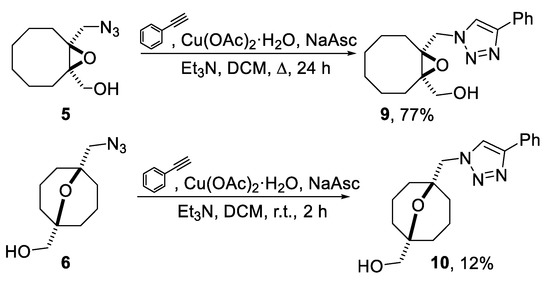 Epoxide 5 was involved in the reaction with phenylacetylene in presence of CuSO4·5H2O/NaAsc at r.t. in DCM, but the reaction proceeded very slowly: 100% conversion was achieved only after 100 h. On the contrary, reflux with Cu(OAc)2·H2O/NaAsc in DCM overnight afforded triazole 9 in a good yield (Scheme 3). It should be noted that oxirane moiety tolerated the reaction conditions. Oxabicyclononane derivative 6, on the contrary, was found to be extremely labile in the reaction conditions even at room temperature. Nevertheless, performing the reaction in the presence of Cu(OAc)2·H2O/NaAsc for 2 h, we managed to isolate azidoalcohol 10, containing oxabicyclo[3.3.1]nonane moiety (Scheme 3).