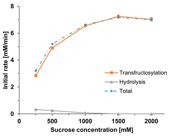 Effect of the initial concentration of sucrose on the initial rates of transfructosylation and hydrolysis. Assay conditions: enzyme concentration of 1.25 U/mL, 55 °C, and 0.1 M citrate-phosphate buffer with pH 5.5.