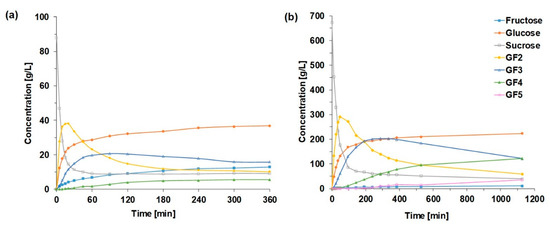 As was mentioned in the Introduction Section, high initial sucrose concentrations are applied in the industrial FOS production. In the experiment presented in Figure 2b, the final concentration of FOS was 340 g/L, but the highest value of 420 g/L was achieved after about 2 h. Thus, shorter reaction times for the enzyme concentration used in this series of experiments were more relevant from the point of view of the maximization of FOS yield.