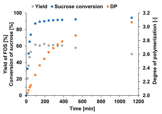 The progress curve of DP presented in Figure 4 quantifies the increase in the mean size of the FOS oligomers during the reaction. The DP starts at the value of two at zero time. The rate of increase in DP was much slower than those of sucrose conversion or FOS yield were. The DP was about 2.3 at the time when the conversion approached 90% and the yield was 60%. In the period of more-or-less constant conversion and yield, which lasted until about 6 h, the DP increased to a value of about 2.7. Until the end of the experiment, at the 19th hour, the DP increased to 3.1. These results show that the reaction time can be used to control the optimal composition of the FOS mixture with regard to its application.