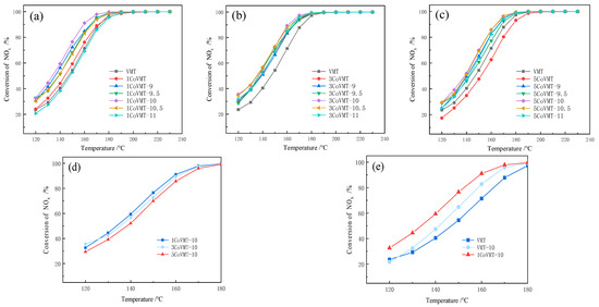 NH3-SCR activity: (a) 1CoVMT series; (b) 3CoVMT series; (c) 5CoVMT series; (d) 1Co/3Co/5CoVMT-10; (e) VMT/VMT-10/1CoVMT-10.