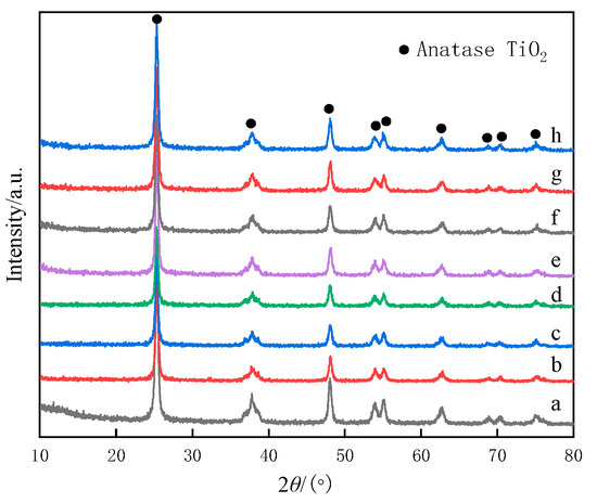 The diffraction peaks at 25.3°, 37.8°, 48°, 54°, 55°, 62.8°, 69°, 70.3°, and 75° were attributed to anatase TiO2 (Figure 4). No rutile crystal phase and active components (CoOx, VOx, MoOx) were observed during XRD analysis, suggesting that they were well-dispersed on the support structure, or the amount of rutile crystal phase and active components were too low to be detected.