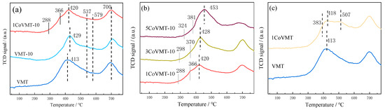 H2-TPR profiles of the catalyst samples: (a) VMT/VMT-10/1CoVMT-10; (b) 1Co/3Co/5CoVMT-10; (c) VMT/1CoVMT.