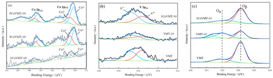 H2-TPR measurements were carried out for the samples. As shown in Figure 5, 3 Tmax types could be observed: isolated monomeric species (≤497–507 °C), polymeric species (537 °C), and bulk amorphous V2O5 (579 °C) [20]. The difference observed for VMT and VMT-10 at 413 °C and 429 °C, respectively, in Figure 5a, indicated that isolated monomeric species could be caused by ammonium hydroxide. For polymeric and bulk amorphous species, due to overlapping characteristic peaks, we conducted peak separation analysis for the two peaks at 537 °C and 579 °C, as seen in Figure S2, and filled the peak area of vanadyl species from the fitting data present in Table S2. The results showed that the monomeric species of the VMT catalyst accounted for approximately 60.7%, and after the addition of NH4OH, the proportion of monomeric species in the catalyst increased to 78.6%. Furthermore, the monomeric species of the 1CoVMT-10 catalyst reached the maximum proportion to 79.4%, and its bulk amorphous species decreased to the lowest value among the three catalysts, indicating that the modification indeed increased the quantity of the monomeric species on the catalyst surface. According to the research of S. Besselmann, polymeric and crystal vanadiums on V/Ti catalysts can be selectively removed after washing with aqueous ammonia, resulting in monomeric species [17]. It is generally believed that monomeric V species activate catalysts better than polymerized V2O5 [21]. The reaction of H2 with V5+ eventually generates V3+ [22]. The peak at 700 °C is characteristic of the transformation of V2O5 to V6O13 [21], while others believe that it could also be due to the decomposition of bulk V2O5 [20].