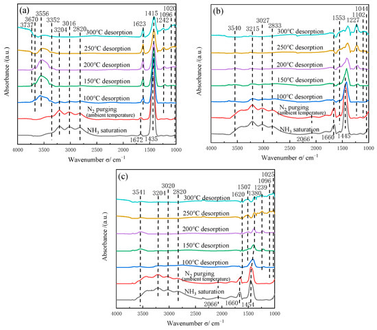 The infrared absorption bands at 1242 cm–1 (Figure 8a), 1227 cm–1 (Figure 8b), and 1239 cm–1 (Figure 8c) were similar to those at 1623 cm–1 (Figure 8a) and 1620 cm–1 (Figure 8c). All of them can be attributed to the asymmetric bending vibrations of the N–H bonds during the N–H chemisorption at the Brønsted acidic sites [21,37], which appeared at 150 °C and could be detected at high temperatures. The band at 3352 cm–1 can be ascribed to asymmetric N–H stretching vibrations at the Lewis acidic sites (Figure 8a) [37,38,39]. The absorption bands at 3556, 3670, and 3737 cm–1 were attributed to the O–H tensile vibrations caused by the interaction between surface hydroxyl groups and NH3 [39,40]. From Figure 8a–c, the bands observed at 2820, 2833, 3016, 3020, 3027, 3204, and 3215 cm–1 can be attributed to NH4+ species [41]; meanwhile, these species could be easily desorbed at 150 °C on the catalyst surface, which was in accordance with the results of NH3-TPD.