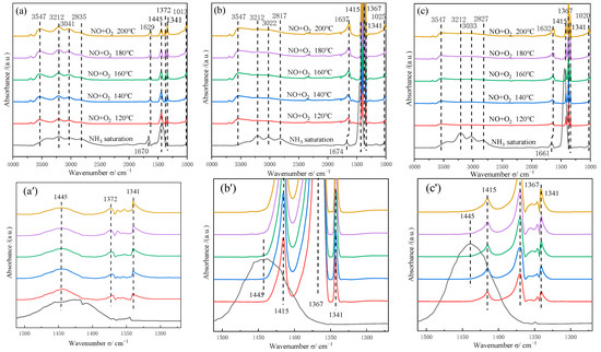 We have zoomed in on the 1250–1500 cm−1 range of the infrared spectrum in Figure 9a′–c′. The asymmetric bending vibrations of NH4+ chemisorbed on Brønsted acid can be observed at 1445 cm−1 and 1415 cm−1 in Figure S2 [6,26,43]. The 1341 cm−1 band was attributed to NOx species, while the 1372 cm−1 and 1367 cm−1 bands corresponded to nitrate species [37,44].