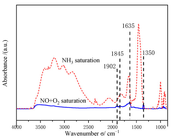 Studies have shown that a limited amount of NO can be adsorbed on V/Ti catalysts [50,51]. Whereas, in Figure 10, the adsorption bands of NO (1902, 1845 cm–1), NO2 (1635 cm–1), and –NO2 (1350 cm–1) could still be observed. Based on the contents mentioned above, the reaction of oxidized intermediates of NO2 and adsorbed NH3 on the surface of VMT-10 and 1CoVMT-10 promoted SCR, proving that this process might also follow the L–H (Langmuir–Hinshelwood) mechanism [39].