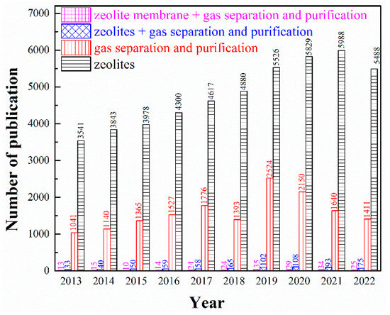 In recent years, zeolites as advanced functional materials have attracted extensive attention in more and more research fields, especially in the petroleum and chemical industries. Different from disordered porous materials such as activated carbon (including carbon molecular sieve), silica gel, porous alumina and diatomite, zeolites are ordered crystalline and porous materials constructed by TO4 tetrahedrons (T = Al, Si, P, Ti, etc.) as building blocks connected to each other by oxygen atoms, with regular pore structure, high micropore volume and specific surface area, as well as outstanding thermal, mechanical and chemical stability [3]. The negative charged TO4 tetrahedrons which are balanced by counter-ions (such as Na+, K+, or Ca2+) make the surface of zeolites highly polarized to easily adsorb molecules with strong polarity. Moreover, the channel dimensions of zeolites generally fall in the sub-nanometric scale, comparable with the kinetic diameters of small molecules, which can be adjusted by ion-exchange properties and by modifying the Si/Al ratio during synthesis [4]. Moreover, artificially-synthesized zeolites made with cheap and easily available raw materials also ensure high purity and consistency of products [5]. Zeolitic membrane is a kind of inorganic porous membrane, which refers to the continuous defect-free membrane formed by the growth of zeolites. It has the unique properties of zeolite itself, such as pore size uniformity, ion exchange, acid-base resistance and high-temperature resistance, which has been widely adopted by virtue of its advantages over organic polymer membrane in high-temperature resistance and easy control of microporous structure in nanoscale. Thereupon, zeolite-based adsorbents and membranes have extensive application value for gas separation. As emphasized in Figure 1, the number of publications concerning on zeolite-based adsorbents or membranes in gas separation and purification has experienced a considerable growth in recent decades. Although its overall research is still in its infancy and in its rapid development stage, zeolite-based adsorbents or membranes exhibit great potential in the field of gas separation and purification from the perspective of a very limited number of research results showing excellent separation effects.