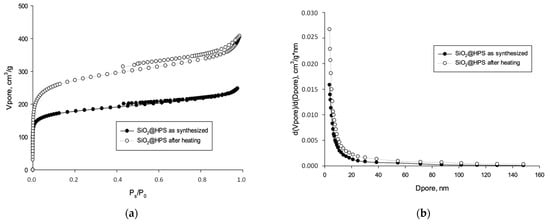 During preparation of the SiO2@HPS sample, APTES is hydrolyzed by the subcritical water, leading to the formation of silica gel on the polymer surface. Moreover, some covalent and van der Waals interactions between the tert-amino groups of HPS and APTES can also take place, as shown previously [77]. The results of the low-temperature nitrogen physisorption showed that the deposition of the silicon-containing phase on the surface of HPS leads to a decrease in the total specific surface area and the surface area of micropores by about 200 m2/g compared to the as-synthesized sample. This is due to the partial HPS pore blockage while using the APTES as a surface modifier [78]. Moreover, during SiO2@HPS synthesis, APTES partially undergoes hydrolysis with water, forming an amorphous polysiloxane, as already reported [77,79]. Heating under a nitrogen flow, in contrast, increases the surface area, particularly by increasing the mesopores. Such an increase can be correlated with the formation of a SiO2 phase during the calcination and additional decomposition of non-hydrolyzed APTES (see Table 1). The formation of xerogel-like structures with an additional porosity on the inert support while using ethoxysilane as a modifier has also been discussed elsewhere [76,80].