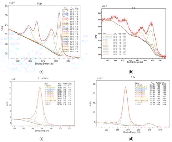 High-resolution Ni 2p and C 1s XPS spectra of the Ni-Ru-SiO2@HPS catalyst before (a,c) and after (b,d) reaction.
