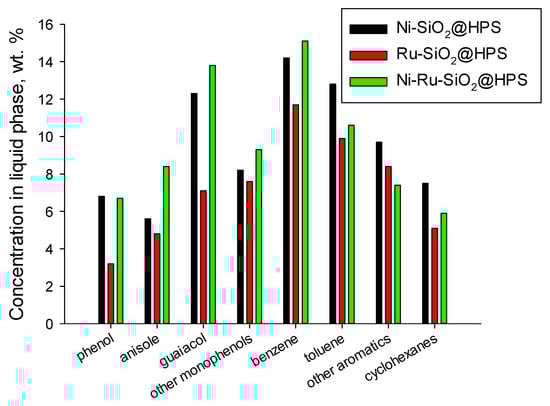 The catalytic performance of the synthesized samples was tested in lignin hydrogenolysis according to the procedure described in Section 3.3. The catalytic performance was characterized by lignin conversion and the total monophenol yield (see Table 4). All synthesized catalysts showed lignin conversion into liquid and gaseous products over 70 wt.%. The highest conversion (over 85 wt.%) was observed when using the bimetallic Ni-Ru-SiO2@HPS sample. For monometallic Ni and Ru catalysts, the conversion was also sufficiently high (>75 wt.%). An increase in the lignin conversion over the bimetallic catalyst can be assigned to synergy between the two metals, leading to an increased electron density on Ni, which facilitates metal reduction due to an increased hydrogen and electron transfer [18,21,28,32,33,35,39]. Ru is known to provide high selectivity to monophenols and aromatics due to its defect-rich structure [50,51].