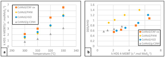 Figure 3a,b present the 4-DMBT HDS performances of the different solids. The ranking is kCoMoS/CNF-ox > kCoMoS/r-GO ≈ kCoMoS/PANI > kCoMoS/g-C3N4. The higher activity of the CNF-ox-based catalyst may be due to its higher dispersion (as observed by HR-TEM) and Co promotion (% Co in the mixed phase) compared to the other catalysts. Conversely, due to the presence of very large slabs coupled with its low promotion rate, CoMoS/g-C3N4 exhibits the lowest activity. If we consider now the DDS/HYD selectivity ratio representative of the two possible pathways of the mechanism (Figure 4), we can observe that a significantly higher ratio is obtained for the CoMoS/PANI sample, whereas the other catalysts follow the same trend (Figure 3b). Interestingly, the DDS/HYD ratio for CoMoS/PANI is higher than 1 above 310 °C, which means that the transformation via the DDS route is favored compared to the HYD. Several CoMo-type catalysts supported on alumina tested in the same operating conditions gave DDS/HYD ratios ranging between 1.2 and 1.5, whereas for the more hydrogenating NiMo-type catalysts values lower than 1 are usually obtained. In other words, CoMo/Al2O3 catalysts usually promote the DDS route of the 4-MDBT hydrodesulfurization; instead, in the case of NiMo/Al2O3, the HYD pathway is preferred [17]. In our case, one can say that CoMoS/PANI promotes the DDS route as usually observed for the CoMoS phase, whereas the other composite catalysts favor the HYD route. Hence, the DDS pathway is not an intrinsic signature of the CoMoS phase. Moreover, for all the catalysts, the increase in the HDS reaction rate is due to the increase in the DDS contribution, since the DDS/HYD ratio increases with T (and HDS). This evolution is in agreement with the literature since usually the activation energy for DDS is higher than for the HYD route [18].