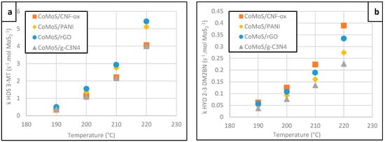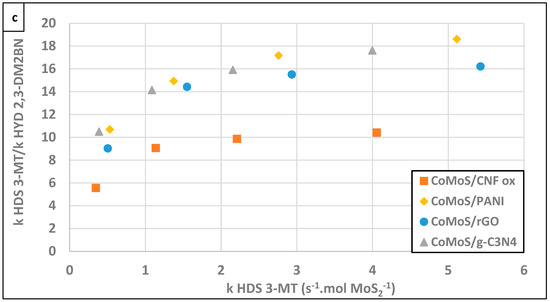 Figure 5a–c present the results of the catalytic tests performed on the 3-MT/2-3 DM2BN mixture. The 3-MT HDS activity of the CoMoS/PANI and CoMoS/rGO are slightly higher compared to g-C3N4- and CNF-ox-based composites (Figure 5a). The lowest activities for both 3-MT HDS (Figure 5a) and 2-3 DM2BN HYD (Figure 5b) molecules were observed for the CoMoS/g-C3N4. Again, we may invoke its poor Co promotion rate and large/stacked slabs to explain this last result. In the case of the CoMoS/CNF-ox, 3-MT hydrodesulfurization is likely limited by the competitive olefin hydrogenation reaction since this catalyst is quite active for that reaction too, with in turn a poor kHDS/kHYD selectivity compared to its counterparts (Figure 5c).