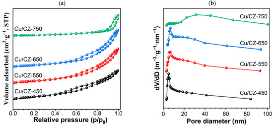 The textural properties of these catalysts were measured using N2 adsorption–desorption measurements. As shown in Figure 2a, all the Cu/CZ-X displayed a typical type-IV adsorption and desorption curve and H3-type hysteresis loop [44,47]. This was attributed to the capillary condensation of mesoporous materials, indicating the presence of irregular porosity [2]. Figure 2b shows the distribution of the pore size over the samples. The pore sizes of Cu/CZ-450, Cu/CZ-550, and Cu/CZ-650 were mainly concentrated at 5, 6, and 7 nm, respectively. However, the pore size of Cu/CZ-750 is located mainly around 30 nm, indicating that its texture was significantly impacted by the calcination temperature. The specific surface area, pore volume, and average pore size ae listed in Table 2. It was noticeable that the specific surface area of the catalysts progressively decreased from 57.6 m2·g−1 to 9.5 m2·g−1 when the calcination temperature increased from 450 °C to 750 °C. It confirmed the pore collapse over Cu/CZ-750, which is in line with its extremely low pore volume (Table 2). As the surface area increased, more surface-active centers were exposed to reactants, usually promoting catalytic activity [49]. Therefore, the Cu/CZ-750 exhibited inferior activity, which was closely related to the small specific surface area.