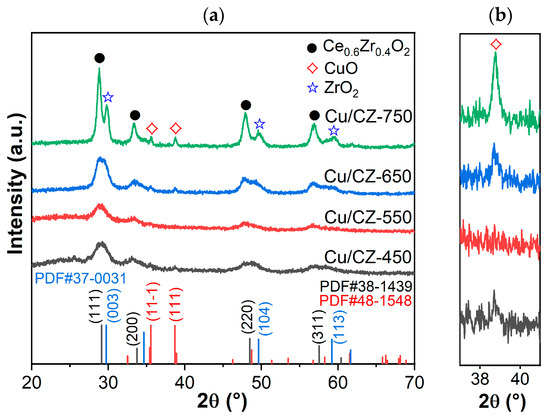 XRD measurements of Cu/CZ-X were implemented to confirm the crystal phase of the samples, and these are shown in Figure 3. For all samples (Figure 3a), the main diffraction peaks at 29.2°, 33.8°, 48.5°, and 57.6° can be attributed to the (111), (200), (220), and (311) planes of Ce0.6Zr0.4O2 solid solution (PDF#38-1439), respectively, which is in good agreement with the ratio of the experimental preparation. It was clearly seen that the diffraction peaks at 29.8°, 49.7°, and 59.2° were attributed to the (003), (104), and (113) planes of ZrO2 (PDF#37-0031), respectively, when the calcination temperature was 450 °C, 650 °C, 750 °C. That was due to the separation of the Ce0.6Zr0.4O2 phase to produce ZrO2. However, Cu/CZ-550 did not have contributions from ZrO2 probably because of a slight difference in synthesis. The diffraction peak centered at 35.6° and 38.7° could be assigned to CuO (PDF#48-1548). It appeared to suggest that the intensity of the peak towards CuO increased with increasing calcination temperature (Figure 3b). However, almost no peak corresponding to CuO was observed in terms of Cu/CZ-550, indicating its high dispersion of copper species on the surface and the presence of a strong interaction between these species and Ce0.6Zr0.4O2 [2]. Ce0.6Zr0.4O2 and CuO crystal sizes were estimated using Scherrer’s formula from the Ce0.6Zr0.4O2 (111) and CuO (111) facets of XRD, respectively (Table 2). The support crystal sizes of Cu/CZ-450, Cu/CZ-550, Cu/CZ-650, and Cu/CZ-750 were, respectively, 4.9, 5.3, 5.7, and 10.1 nm, which indicated that the agglomeration at the high calcination temperature led to larger sizes. Indeed, the CuO crystal size of Cu/CZ-750 was 22.3 nm as a result of agglomeration.
