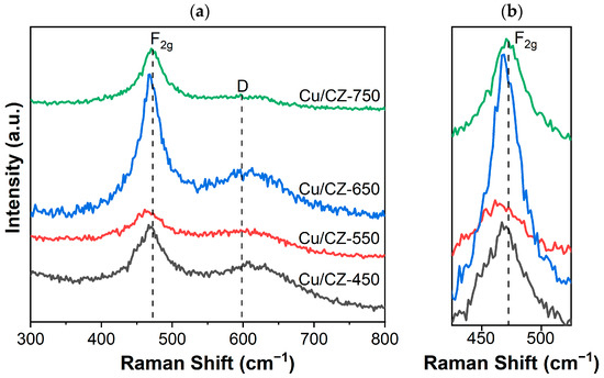 The structure of the catalysts was further investigated using Raman measurements. As displayed in Figure 4a, the two peaks at 462 and 598 cm−1 were observed over all of the samples [28], which were attributed to the vibration model of octahedral local symmetry from the CeO2 lattice (F2g) and the defect-induced mode (D mode), respectively [27]. A blue shift of the feature (472 to 460 cm−1) toward the F2g mode was seen as increasing the calcination temperature, indicating the different structures present in these samples (Figure 4b). The D mode was attributed to the formation of oxygen vacancies, which were derived from structural defects [28]. The oxygen vacancy concentrations on the samples were assessed by estimating the ratio of the intensities in the D band and F2g band (ID/IF2g) [50]. Notably, as presented in Table 2, the ratio of ID/IF2g was remarkably higher in Cu/CZ-550 (0.61) than in Cu/CZ-450 (0.50), Cu/CZ-650 (0.55), and Cu/CZ-750 (0.30), respectively. This illustrated the highest oxygen vacancy concentration in Cu/CZ-550 than in the other samples. The high oxygen vacancy concentration was conducive to the absorption and activation of gaseous O2 and promoted the diffusion of reactant molecules, which is in agreement with the catalytic activity.