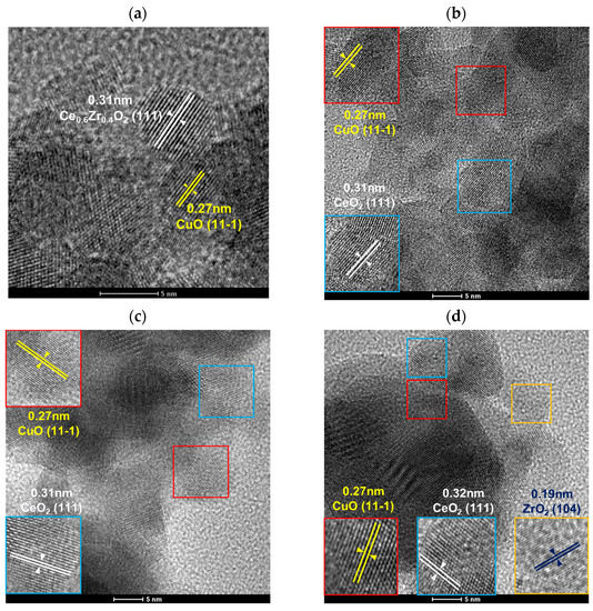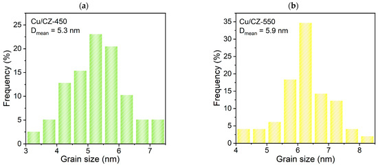 The structures of all of the samples were investigated using TEM. As displayed at Figure 5, it was easily observed that all samples presented clear lattice fringe distances of 0.31 nm and 0.27 nm, corresponding to CeO2 (111) and CuO (11-1), respectively. In addition, Cu/CZ-750 had a lattice fringe distance of 0.19 nm which was attributed to ZrO2 (104). The mean grain sizes and the distributions of grain size over the Cu/CZ-X samples were calculated using the TEM images (Figure 6), and they are listed in Table 3. The average grain sizes (d) of Cu/CZ-450, Cu/CZ-550, Cu/CZ-650, and Cu/CZ-750 were 4.9 nm, 7.3 nm, 9.2 nm, and 10.8 nm, respectively. Noteworthily, the grain sizes increased with the increasing calcination temperature.