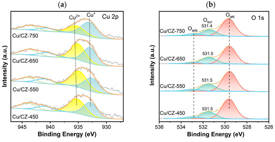 The surface composition and chemical state of the samples were examined using XPS measurements. In Figure 7a, the peak centered at 933.1–933.8 eV corresponded to Cu+, while the peak at 935.4–935.9 eV and the two satellite peaks belonged to Cu2+ species [51,52,53]. As displayed in Table 3, the binding energy (BE) of Cu2+ over Cu/CZ-550 (934.8 eV) was quite different from those in Cu/CZ-450 (935.2 eV), Cu/CZ-550 (935.23 eV), and Cu/CZ-750 (935.4 eV), respectively. The results indicated that the chemical environments of Cu2+ over these samples were different. The ratio of the surface Cu2+/(Cu2+ + Cu+) is listed in Table 3. It is worth noting that the ratio of Cu2+/(Cu2+ + Cu+) gradually increased when increasing the calcination temperature to 550 °C. Nevertheless, the values of Cu2+/(Cu2+ + Cu+) decreased rapidly from 0.58 to 0.35 when further increasing the calcination temperature from 550 to 750 °C. Thus, Cu/CZ-550 possessed the highest concentration of surface Cu2+ species. Generally, the Cu2+ component was considered to be the catalytically active site involved in toluene oxidation [40]. Thus, Cu/CZ-550 would show accepted catalytic activity, which is in line with the results of the performance tests.