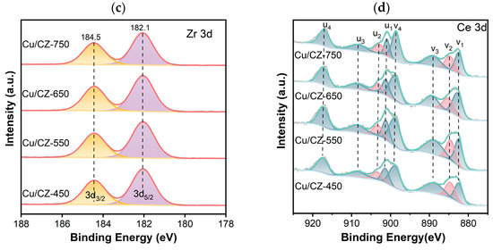 As described in Figure 7d, Ce 3d XPS spectra 3d3/2 and 3d5/2 were marked as u and v, respectively. The peaks at 917.3 eV (u4), 908.5 eV (u3), 900.8 eV (u1), 898.3 eV (v4), 889.6 eV (v3), and 882.7 eV (v1) were assigned to surface Ce4+ species, and the peaks at 903.5 eV (u2) and 885.2 eV (v2) corresponded to surface Ce3+ species. A higher ratio of Ce3+/(Ce3+ + Ce4+) (0.22) was found over Cu/CZ-550 in comparison to those over Cu/CZ-450 (0.19), Cu/CZ-650 (0.18), and Cu/CZ-750 (0.17), respectively. Ce3+ species were normally associated with the formation of oxygen vacancies, which could favor oxygen mobility [27,28]. Thus, Cu/CZ- might have more oxygen vacancies, which is in good agreement with Raman spectrum results, showing excellent catalytic activity.