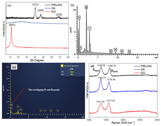 The XRD analysis of PtRu/GA, GA and GO is shown in Figure 1a. The dominant peak for GA and the XRD pattern with a gap between layers of 3.42 Å was found at 26°. This value is greater than that for the graphite plane, i.e., 3.34 Å, but much smaller than the value of 8.7 Å obtained from the GO peak of 10.6° in 2θ. By removing several oxygen-containing functional groups from GO, a decrease in the distance between layers from GO to GA can be observed. In addition, GA has a broader gap between layers than graphite, indicating residual functional groups on its surface.