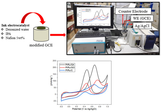 Merck provided a platinum precursor (H2PtCl6) with a Pt concentration of 40%. Graphene oxide was obtained from GO Advanced Solution Sdn. Bhd. Ruthenium precursor (RuCl4), isopropyl alcohol, ethylene glycol (EG), Nafion solution, methanol, and ethanol were obtained from Sigma–Aldrich (St. Louis, MO, USA).