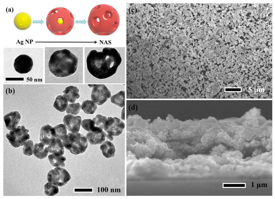(a) Schematic illustration of the procedure to fabricate the NAS, and its microstructure evolution, (b) TEM image of the NASs, (c) plane-view and (d) cross section of the NAS film.