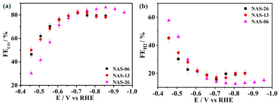 FE for CO (a) and H2 (b) on the NAS films with the thickness of 0.6, 1.3 and 2.6 μm in CO2-saturated 0.1 M KHCO3 electrolyte, pH 6.8.