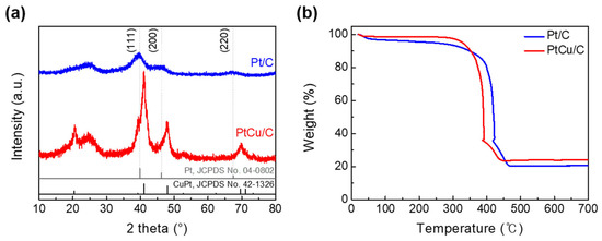 (a) XRD patterns of the Pt/C and PtCu/C catalysts with Pt and PtCu characteristic peaks (JCPDS No. 04-0802 and 42-1326) and (b) TGA curves of the Pt/C and PtCu/C catalysts to determine the metal loading amount.