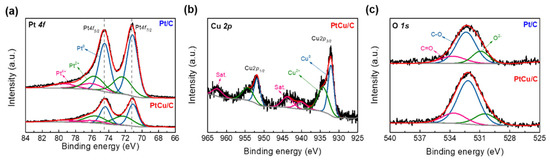 To investigate the electronic structure and surface chemical state of the Pt/C and PtCu/C catalysts, X-ray photoelectron spectroscopy (XPS) was performed. Figure 3 and Table 2 present the high-resolution XPS spectrum of Pt 4f, Cu 2p, and O 1s prepared catalysts. All the binding energies were referenced using the C 1s line at 284.70 eV for calibration. The high-resolution Pt 4f spectrum shows the assigned two peaks corresponding to the doublet Pt 4f7/2 and Pt 4f5/2 states from the spin-orbital splitting. Each peak can be deconvoluted to metallic Pt0, Pt2+, and Pt4+ species in Figure 3a. Compared to Pt/C, the PtCu/C was shifted to lower binding energies in the Pt 4f spectra, indicating the electron transfer from Cu to Pt due to the electronic interaction between Pt and Cu [20,47,48]. Figure 3b shows the high-resolution Cu 2p spectra that present the assigned Cu 2p3/2 and Cu 2p1/2 doublet as Cu0 (932.13 and 951.88 eV) and Cu2+ (934.35 and 954.10 eV) of the PtCu/C catalyst. The metallic Pt (Pt0) is dominant (≈54.3%) in the PtCu/C. The characteristic satellite peaks of 940.10 and 943.73 eV (Cu 2p3/2) and 962.34 eV (Cu 2p1/2) point to the presence of oxidized Cu2+ species near the surface [49,50]. The high-resolution O 1s spectra consisting of three deconvoluted peaks assigned to O2− (530.93 and 530.48 eV), C-O (532.38 and 532.18 eV), and C=O (533.71 and 533.58 eV) bonds did not show substantial differences between the Pt/C and PtCu/C catalysts in Figure 3c. The Pt/Cu atomic ratios determined by the ICP-OES and XPS data are presented in Table 1. The bulk (0.81) and surface (1.38) Pt/Cu molar ratios demonstrate a little difference, indicating that the Cu exists more on the PtCu/C catalyst surface.